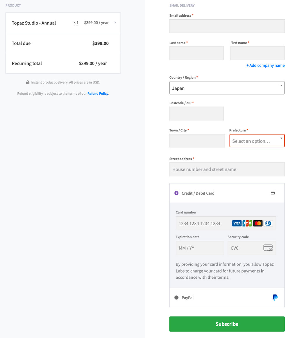 Topaz Labs公式サイトは、クレジットカードまたはPayPal決済のみに対応しています。これ以外の支払い方法(銀行振込、コンビニ払いなど)は利用できません。