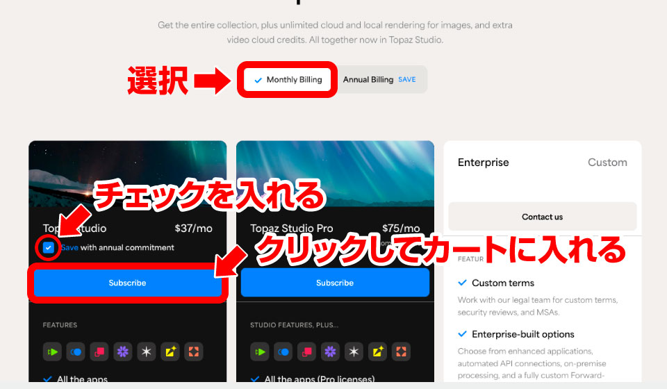 - Topaz Studioの料金下に表示される【Seae whit annual commitment】にチェックを入れる