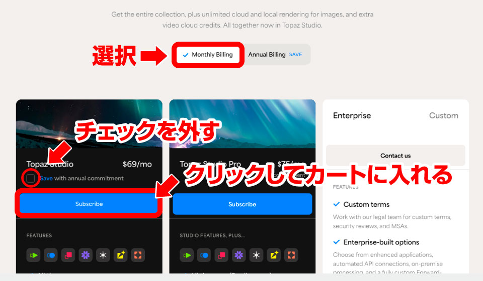 - Topaz Studioの料金下に表示される【Seae whit annual commitment】にチェックを外す