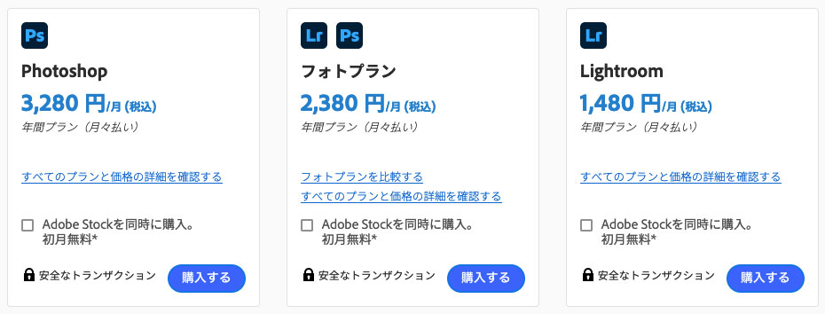 | 個人プラン | フォトプラン | Photoshop単体プラン Lightroom単体プラン |