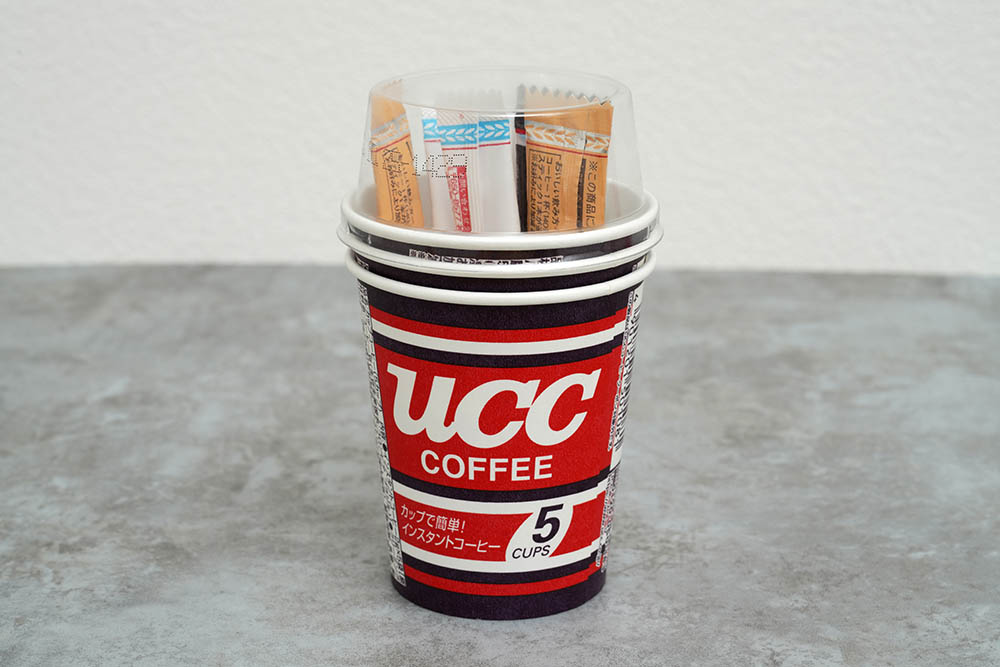 UCCのカップコーヒーも美味しいのでオススメ。コップをヤカン代わりで利用して、140ccのお湯を沸かして紙コップに注げば完成です。1杯あたりのコストは50円前後になります。