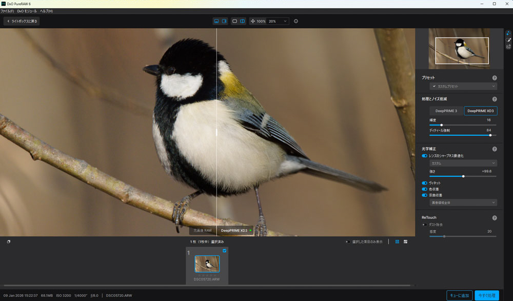 DeepPRIME XD3は、超望遠レンズにテレコンを組み合わせて撮影した際に生じやすい「画質低下」を、ワンランク上に引き上げてくれる処理だと感じました。