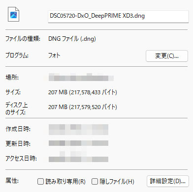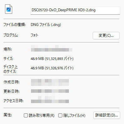 DeepPRIME XD3を「DNG非圧縮」で保存した場合