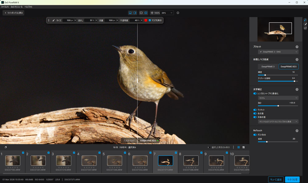 超望遠レンズやテレコンバーターを多用する撮影スタイルでは、DeepPRIME XD3の進化はとくに実感しやすく、「失敗を救済するためのRAW現像」から「撮影を支える前処理による攻めのチャレンジ」へと役割が変わった印象もあります。