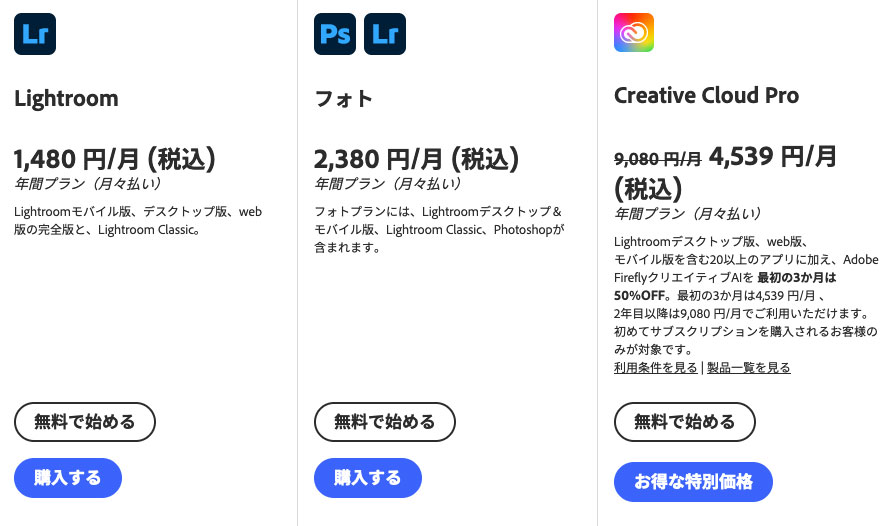Adobe公式サイトで購入できる「Adobe Lightroom Classicが使えるプラン」は下記3点。