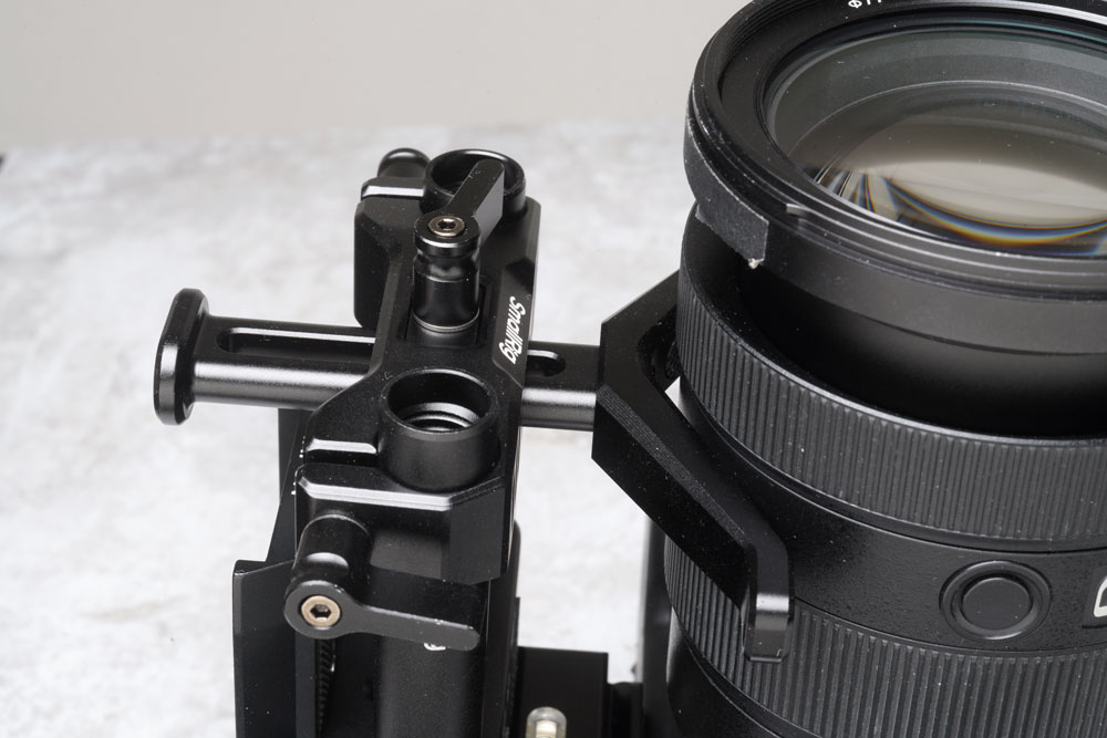 レンズサポートは工具不要で高さや前後位置を調整できるため、標準ズームレンズの交換や位置調整も短時間でおこなえます。ワンマンオペレートでは「素早く戻せる」ことが、そのまま撮影テンポの維持につながります。