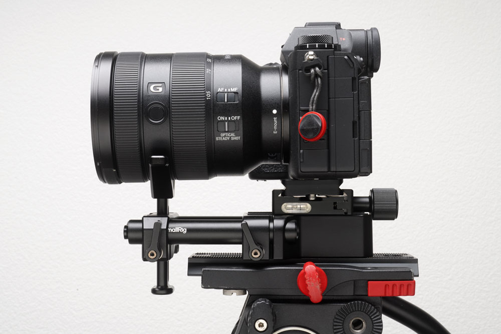 こちらは、ソニーα1 IIにFE 24-105mm F4 G OSSを装着し、「標準ズームレンズ向けミニマム動画リグ」を組んだ状態を例に解説します。