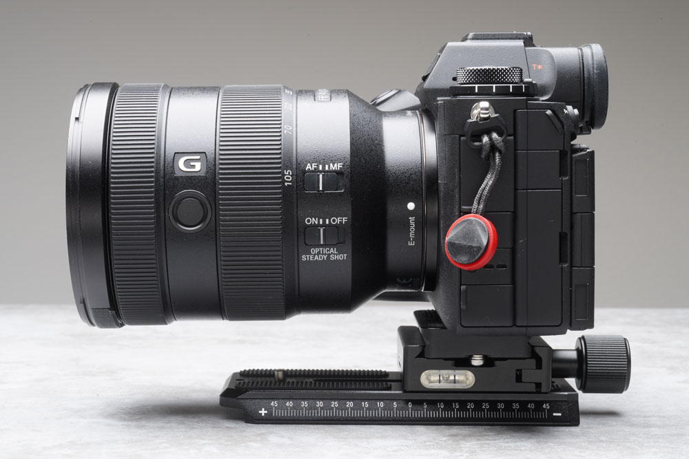 SONY FE 24-105mm F4 G OSSを装着した状態。マンフロット互換クイックリリースプレート(120mm)とのクリアランスはこのような感じです。工具無しで着脱でき、常設運用が可能です。
