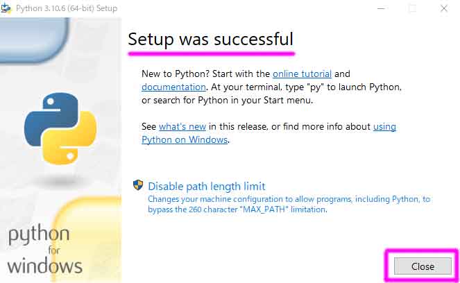 ▲画面に「Setup was successful」が表示されたらインストール完了です。「Close」ボタンをクリックしてインストーラーを終了します。
