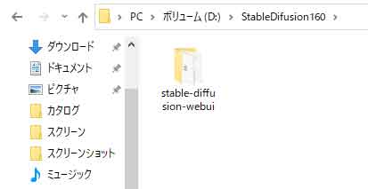 ▲私はパソコン内にSSDを増設し。NTFS形式でフォーマットしました。増設したSSDは「ボリュームD」として表示されます。ここに新規フォルダを作成し、フォルダ名を「StableDiffusion160」に設定。このフォルダにWeb UIをインストールすることにしました。