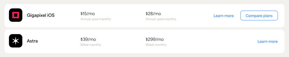 単品最安プランの場合合:Topaz Photo(月額17ドル)+Topaz Gigapixel(月額12ドル)=合計月額29ドル