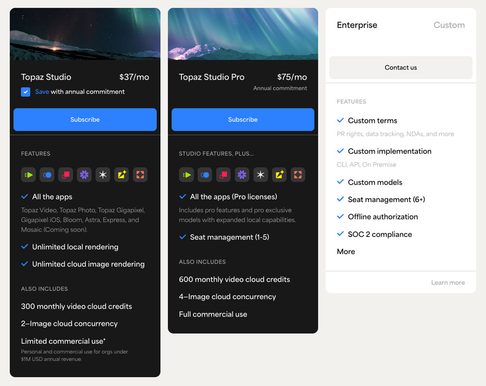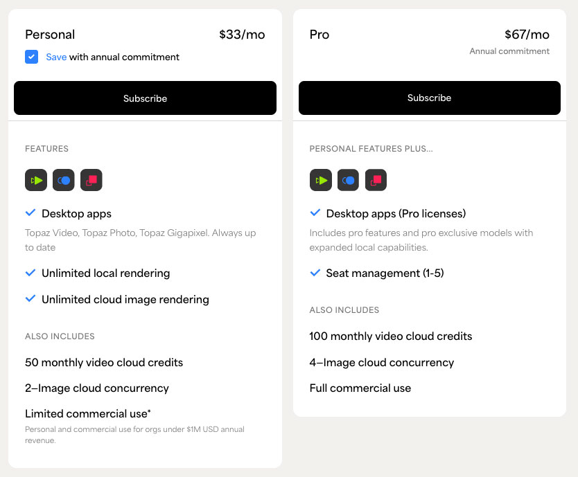 Topaz Labsは、2025年9月17日に新プランの料金体系に移行しました。料金体系が煩雑なため、すべての料金を比較できる一覧表を独自に作成しました。