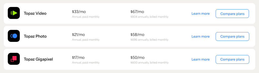 単品最安プラン:Topaz Photo(月額17ドル)+Topaz Video(月額25ドル)=合計月額42ドル