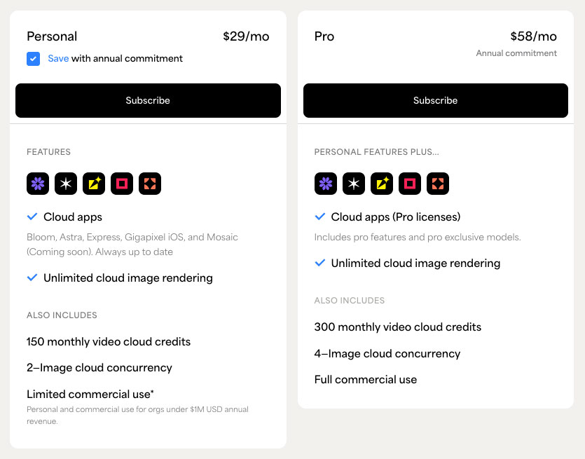 さらに、画像のクラウドおよびローカルレンダリングを無制限に利用できるほか、追加のビデオクラウドクレジットによる有料レンダリングも利用可能です。