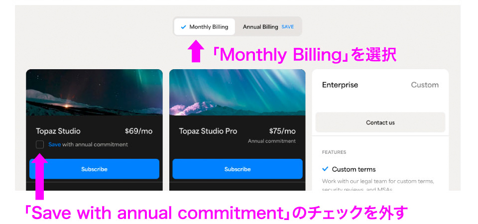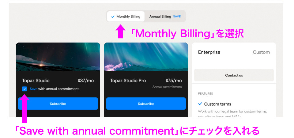 Topaz Labs製品は、購入時に契約形態を選択します。料金を確認後「Sibscribe」ボタンをクリックする。