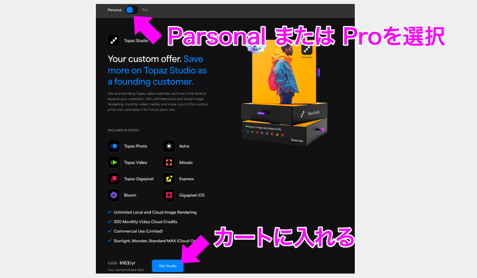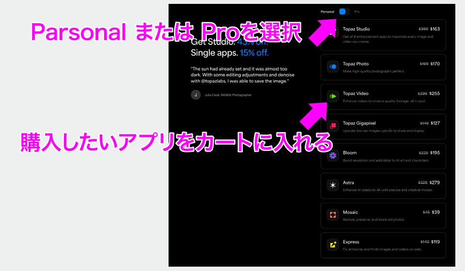 | セール内容 | Topaz Studioが229ドル、単体アプリが15%OFF |