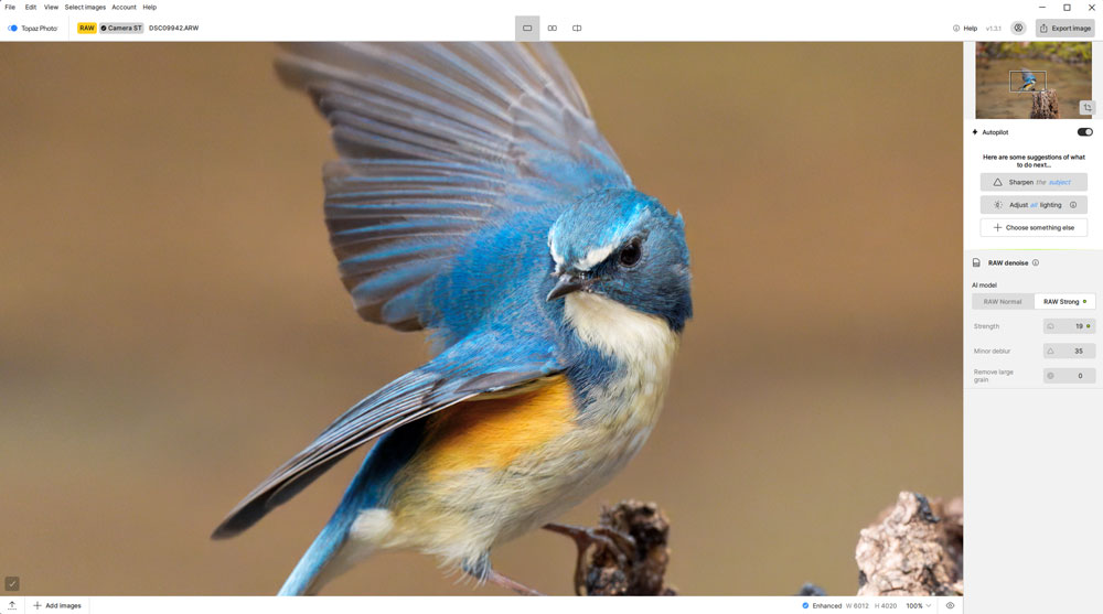 また、Topaz Photoには独自の「Autopilot(オートパイロット)」機能があり、画像を読み込むだけでAIがパラメーター(設定値)を予測し、最適な補正を提案してくれます。基本的な使い方もシンプルで、画像を読み込むだけでAI補正を適用できるため、初心者でも扱いやすい設計になっています。