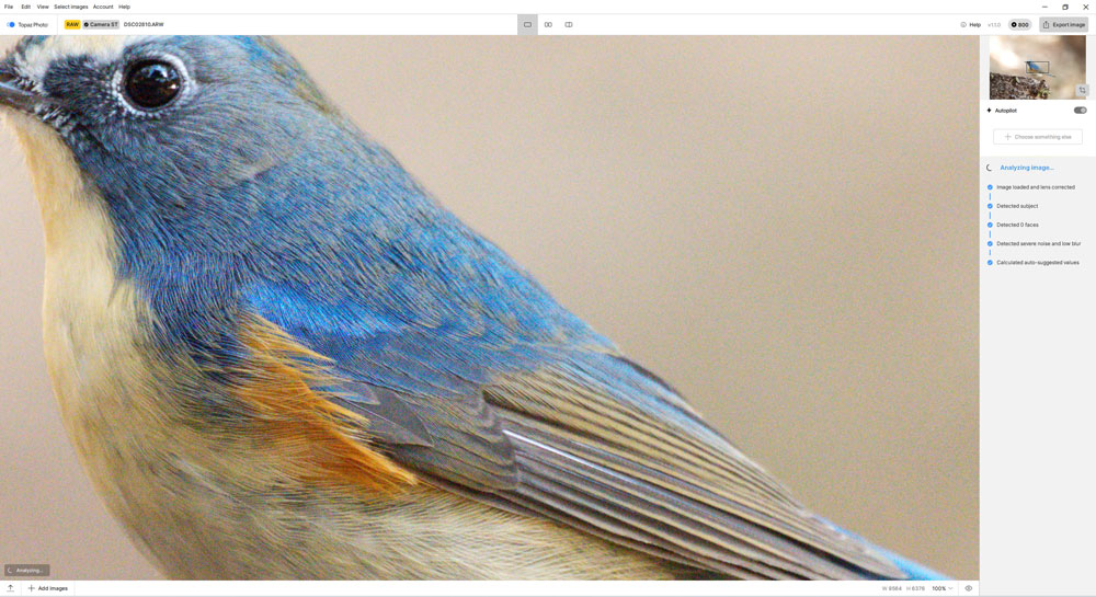 α9IIIで撮影した写真は、積層センサーを採用しているためRAW無修正の状態では輝度ノイズとカラーノイズが目立ちます。Topaz Photo処理後は、クリアな写真に仕上がり、色の再現性も深みが増した印象で、ISO8000が常用できる進化に驚きました。解像度については、Topaz Photoが推論して生成した羽毛の描写が自然に溶け込み、AI生成による不自然さを感じさせない仕上がりになりました。