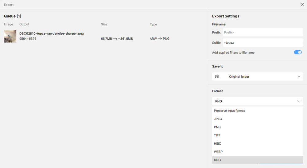 Topaz Photoは、RAW形式の入力に加え、高画質なDNG形式での書き出しに対応しています。
