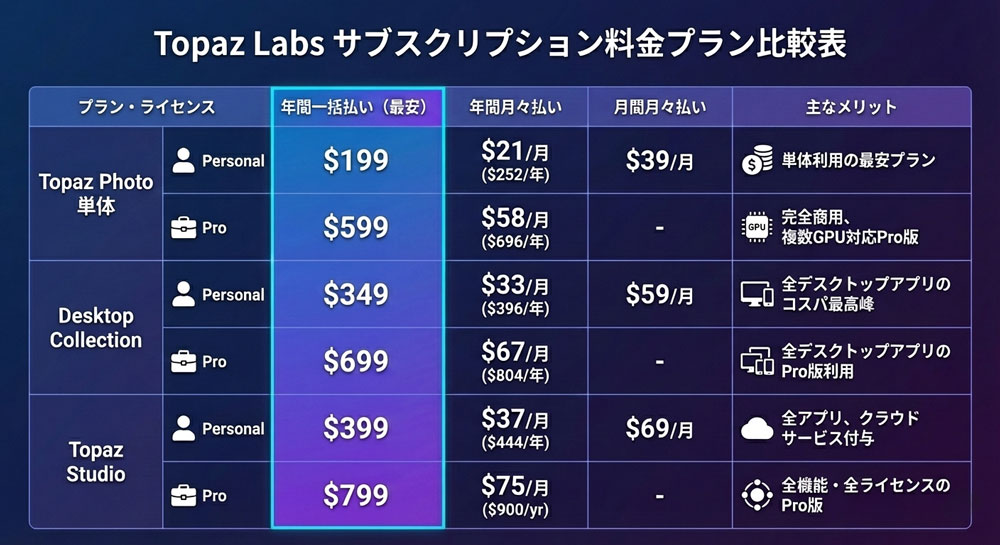 Topaz Photoが高価なサブスクリプションでありながらも選ばれる「価値や優位性」を簡潔に提示します。
